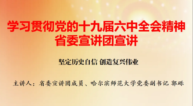 報告會上,省委宣講團(tuán)成員、哈爾濱師范大學(xué)黨委副書記郭礫以《堅定歷史自信 創(chuàng)造復(fù)興偉業(yè)》為題,作了一場生動精彩的宣講報告。報告從深入領(lǐng)會黨的十九屆六中全會精神的重大意義、深刻認(rèn)識全會精神的豐富內(nèi)涵與核心要義和準(zhǔn)確把握貫徹全會精神的實踐要求三個方面,對黨的十九屆六中全會精神進(jìn)行了系統(tǒng)闡釋和細(xì)致解讀。宣講報告主題鮮明、解讀精準(zhǔn),將全會精神與龍江實際結(jié)合緊密,具有很強(qiáng)的理論性和指導(dǎo)性。