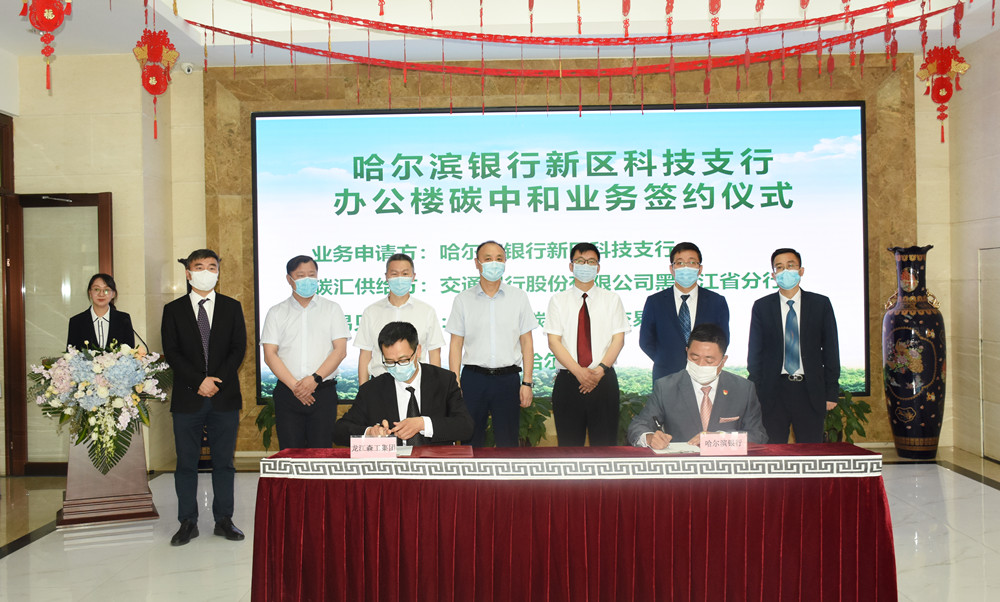 黑龍江碳排放權交易中心在簽約儀式上為哈爾濱銀行新區(qū)科技支行頒發(fā)了碳中和證明書。