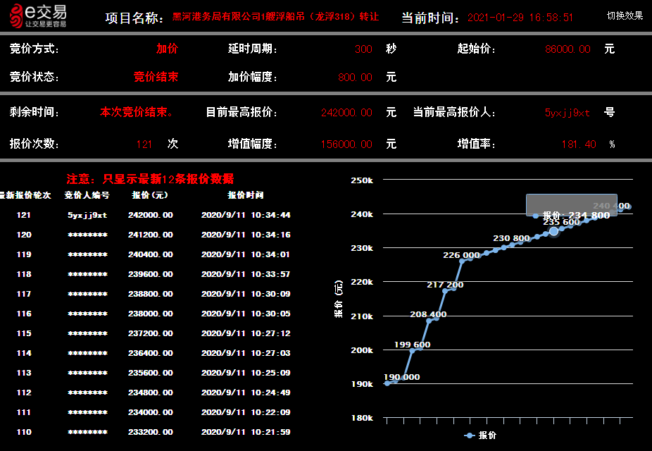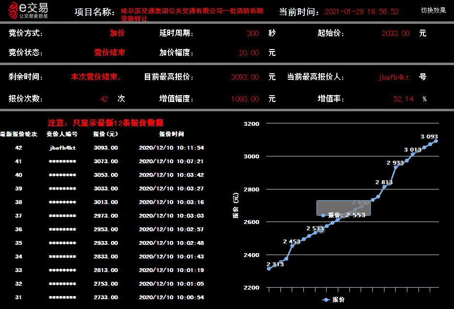 廢舊上游型蒸汽機(jī)車(chē),轉(zhuǎn)讓底價(jià)62.33萬(wàn)元,經(jīng)過(guò)60輪次的競(jìng)價(jià),最終成交價(jià)97.73萬(wàn)元,增值率達(dá)56.79%。多艘廢舊駁船轉(zhuǎn)讓項(xiàng)目,轉(zhuǎn)讓底價(jià)240.85萬(wàn)元,最終成交價(jià)431.89萬(wàn)元,平均增值率達(dá)79.32%。其中,航運(yùn)集團(tuán)一艘浮船吊(龍浮318)轉(zhuǎn)讓項(xiàng)目,公告期滿(mǎn),征集了30家意向方,報(bào)價(jià)次數(shù)達(dá)121次,最終以24.2萬(wàn)元順利成交,增值率達(dá)181.40%。哈爾濱交通集團(tuán)公共交通公司1117臺(tái)報(bào)廢公交車(chē)轉(zhuǎn)讓項(xiàng)目,轉(zhuǎn)讓底價(jià)1069.63萬(wàn)元,成交價(jià)1097.63萬(wàn)元,增值28萬(wàn)元;一批消防拆除設(shè)施轉(zhuǎn)讓項(xiàng)目,轉(zhuǎn)讓底價(jià)2033元/噸,成交價(jià)3093元/噸,增值率高達(dá)52.14%。